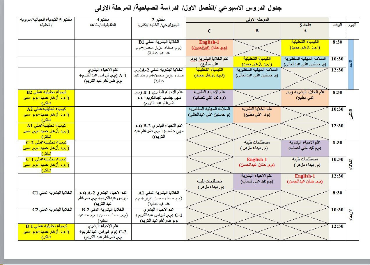 جدول المرحلة الاولى / قسم الفيزياء الطبية/ الدراسة الصباحية