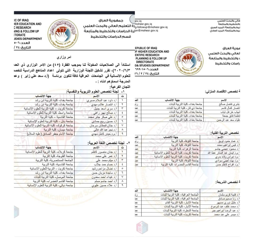 اختيار تدريسي من كلية التربية للبنات/جامعة الشطرة عضواً في لجنة وزارية.