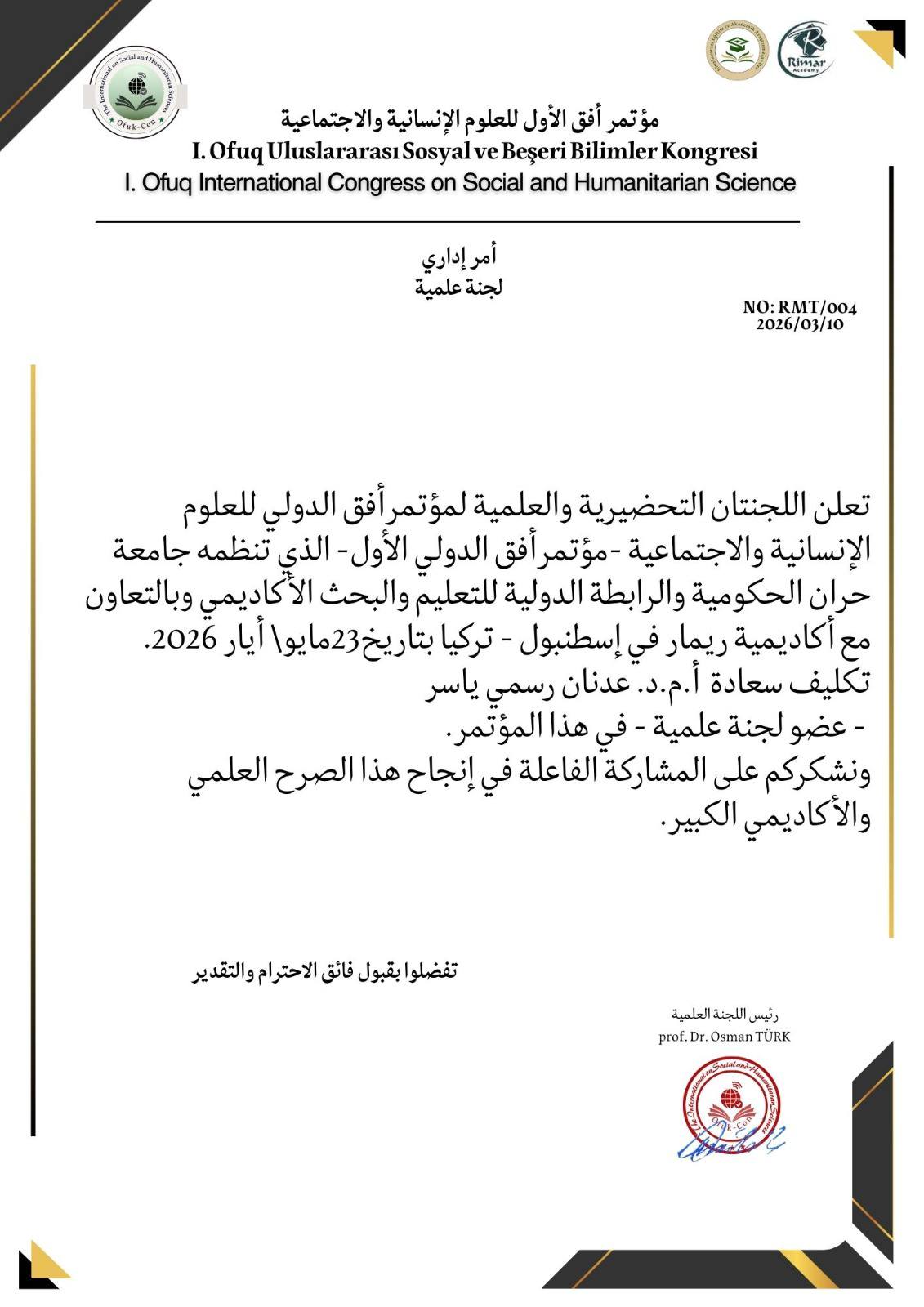 اختير الأستاذ المساعد الدكتور عدنان رسمي ياسر، التدريسي في قسم اللغة العربية – كلية التربية للبنات / جامعة الشطرة، عضوًا في اللجنة العلمية لمؤتمر أفق الأول للعلوم الإنسانية والاجتماعية، الذي ستقيمه جامعة حران الحكومية في تركيا بالشراكة مع أكاديمية ريمار، وذلك بتاريخ 23 /3 /2026.