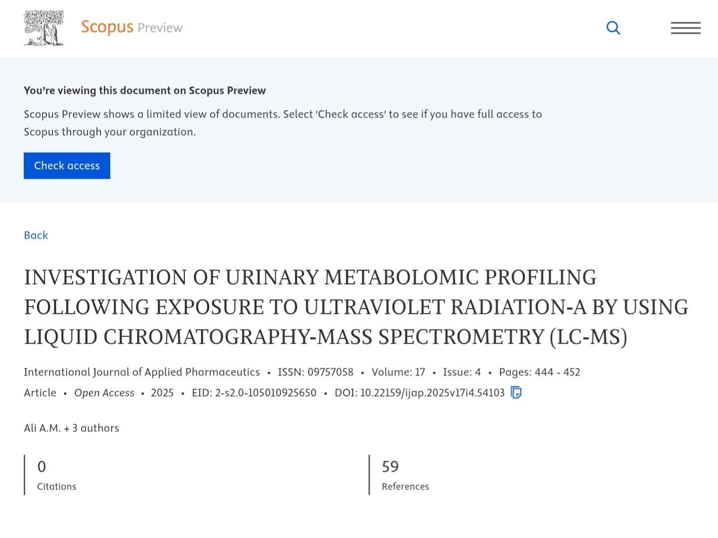 تناولت الدراسة تأثير الأشعة فوق البنفسجية-أ (UVA) على الأيض البولي البشري باستخدام تقنيات LC-MS الحديثة، مع التركيز على التغيرات الأيضية التي قد تشكّل مؤشرات حيوية جديدة للتنبؤ بالتأثيرات الصحية الناتجة عن التعرض للشمس،.